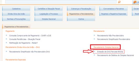 7º Passo - Clique na opção Parcelamento Simples Nacional clique em Emissão de DAS parcela Mínima;