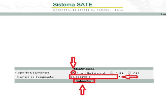 2 - A seguir selecione em “tipo de documento” Inscrição Estadual, em “Numero do Documento” informe o numero de inscrição estadual da empresa, clique na opção Submeter.