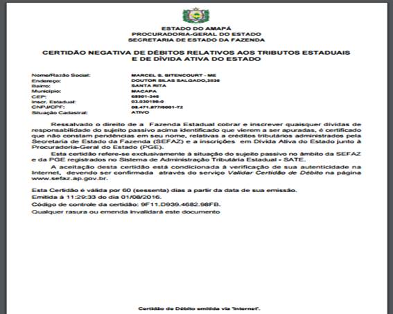 3 – Após ter preenchido os dados solicitados anteriormente, na tela seguinte será emitido à Certidão Negativa de Débitos Relativos aos Tributos Estaduais e de Dívida Ativa do Estado.