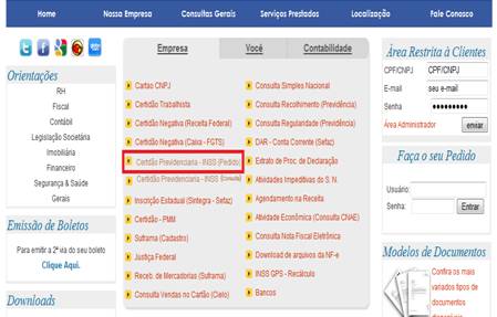 1º Passo - Para fazer o pedido da certidão basta entrar no site www.brasilcontabil.com.br e selecionar a opção “Certidão Previdenciária - INSS (Pedido)”.