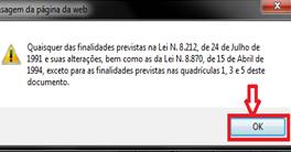 2º Passo- Selecione a opção CNPJ (Cadastro Nacional de Pessoa Jurídica) para pessoa Jurídica, para pessoa física marque a opção CEI (Cadastro Específico do INSS), após informe o número do CNPJ e/ou CEI. Em seguida marque a opção 4 – as Outras finalidades do art.47da Lei nº 8212, de 24/07/91, no momento que esta opção for selecionada aparecerá à tela abaixo, clique no botão “OK”