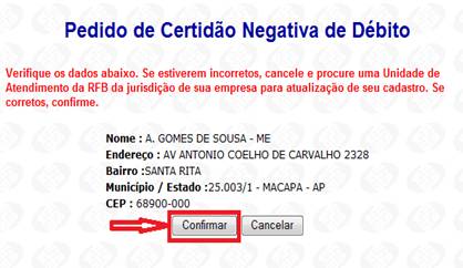 3º Passo – Na tela “Pedido de Certidão Negativa de Débito” clique no botão “confirmar”