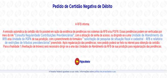 3.2 - Havendo pendência abrirá a tela abaixo, informado que não foi possível a emissão da CND em razão da existência de débito.
