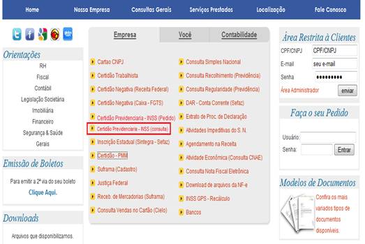 1º Passo – No site www.brasilcontabil.com.br, clique na opção “Certidão Previdenciária – INSS (Consulta)”
