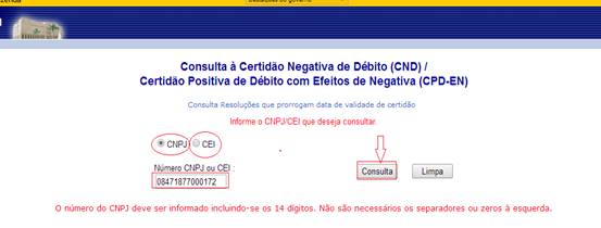 2º Passo - Na tela abaixo selecionea opção “CNPJ” (Cadastro Nacional de Pessoa Jurídica) para pessoa Jurídica, para pessoa física selecione a opção CEI (Cadastro Específico do INSS), após digite o número do CNPJ e/ou CEI desejado na opção “Número CNPJ ou CEI”, após clique no botão Consultar.