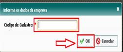 3º- Na tela abaixo em “Código de Cadastro” digite o número de cadastro da empresa na Prefeitura Municipal, após clique no botão “OK”.