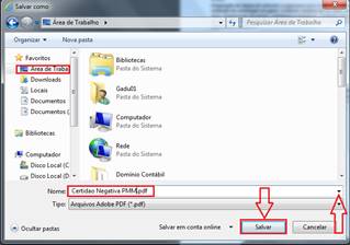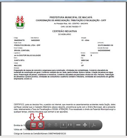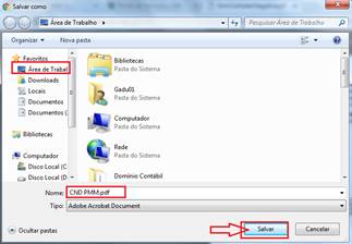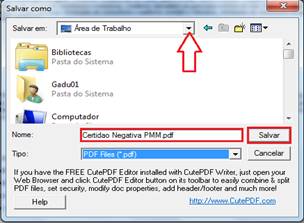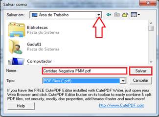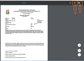 6º - A CERTIDÃO DA PMM será demonstrada, na parte inferior da tela clique botão “SALVAR” ou clique botão “IMPRIMIR” (caso possua o PDF instalado) para salvar a mesma em seu computador.