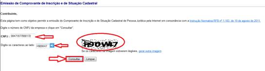 3º - Na janela “Emissão de comprovante de Inscrição e de Situação Cadastral”, no campo “CNPJ” digite o número do CNPJ da empresa sem ponto e sem barra, em seguida digite os caracteres disponibilizados ao lado pelo site da Receita, após clique no botão “Consultar”.