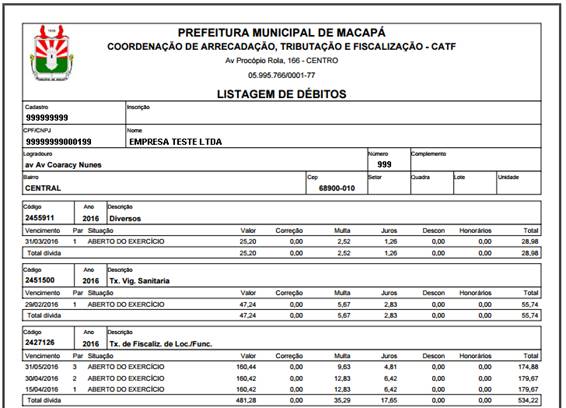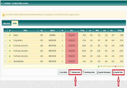 – Após ter clicado em Selecionar Todos e Imprimir Todos, na tela seguinte aparecerá o espelho com todos os débitos que constam na esfera municipal.