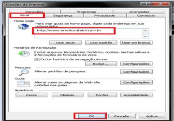 4º Passo-Na janela opções da internet, na aba Geral, opção Home Page, no local indicado informe o site www.brasilcontabil.com.br, após clique no botão OK, para a alteração seja salva;