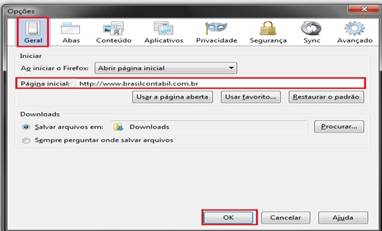 4º - Passo – Na janela Opções, no campo Página inicial informe o site www.brasilcontabil.com.br, após clique no botão OK;