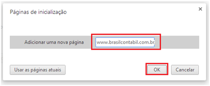 5º Passo – Na próxima página no campo Adicionar uma página informe o site www.brasilcontabil.com.br, após clique no botão OK;